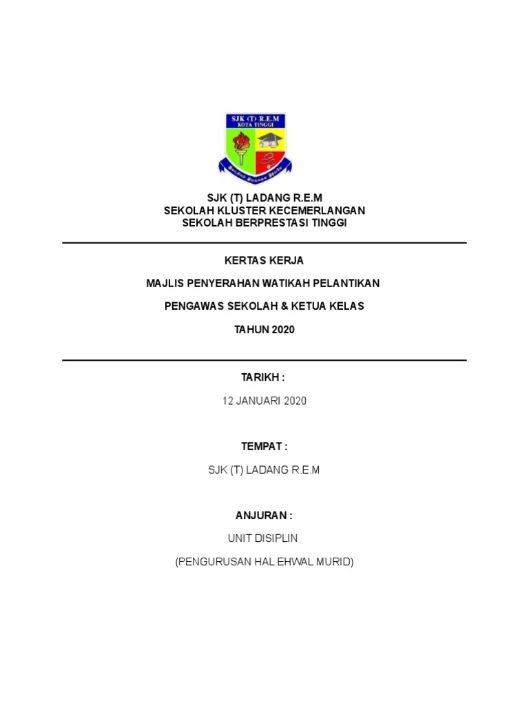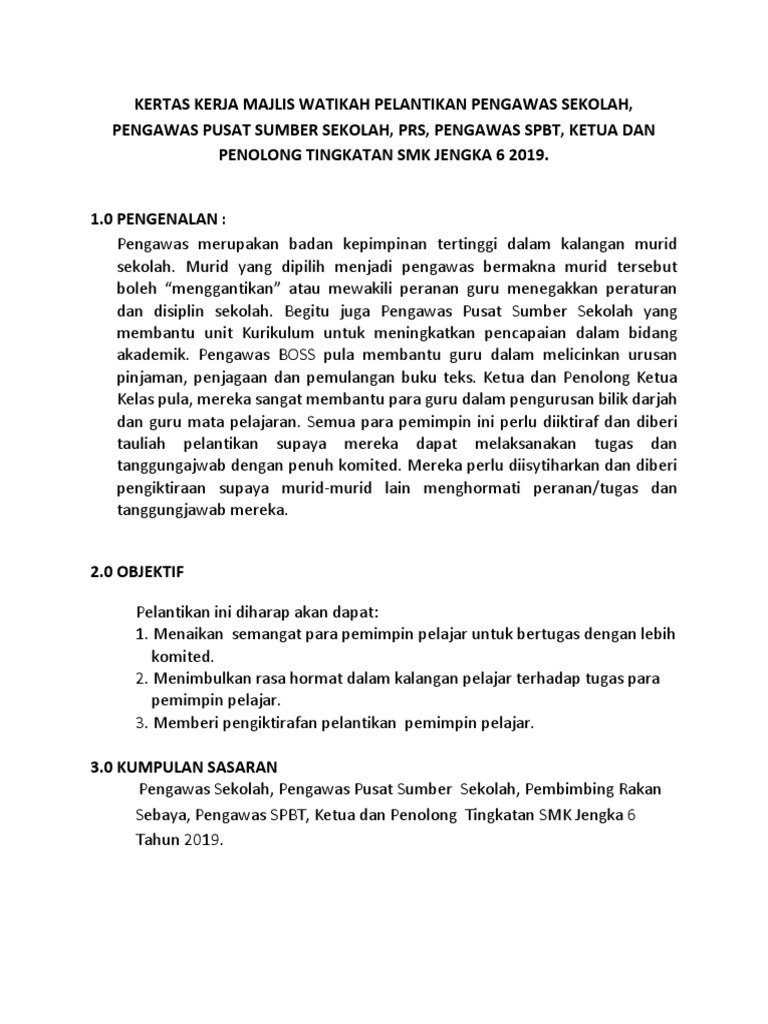 . 31 Memberi pengiktirafan dan semangat kepada pengawas supaya melakukan tugas yang diamanahkan oleh pihak sekolah dengan dedikasi dan penuh bertanggungjawab. KERTAS KERJA WATIKAH PELANTIKAN PEMIMPIN MUDA SEKOLAH. Dengan hormatnya saya merujuk mengenai perkara di atas.