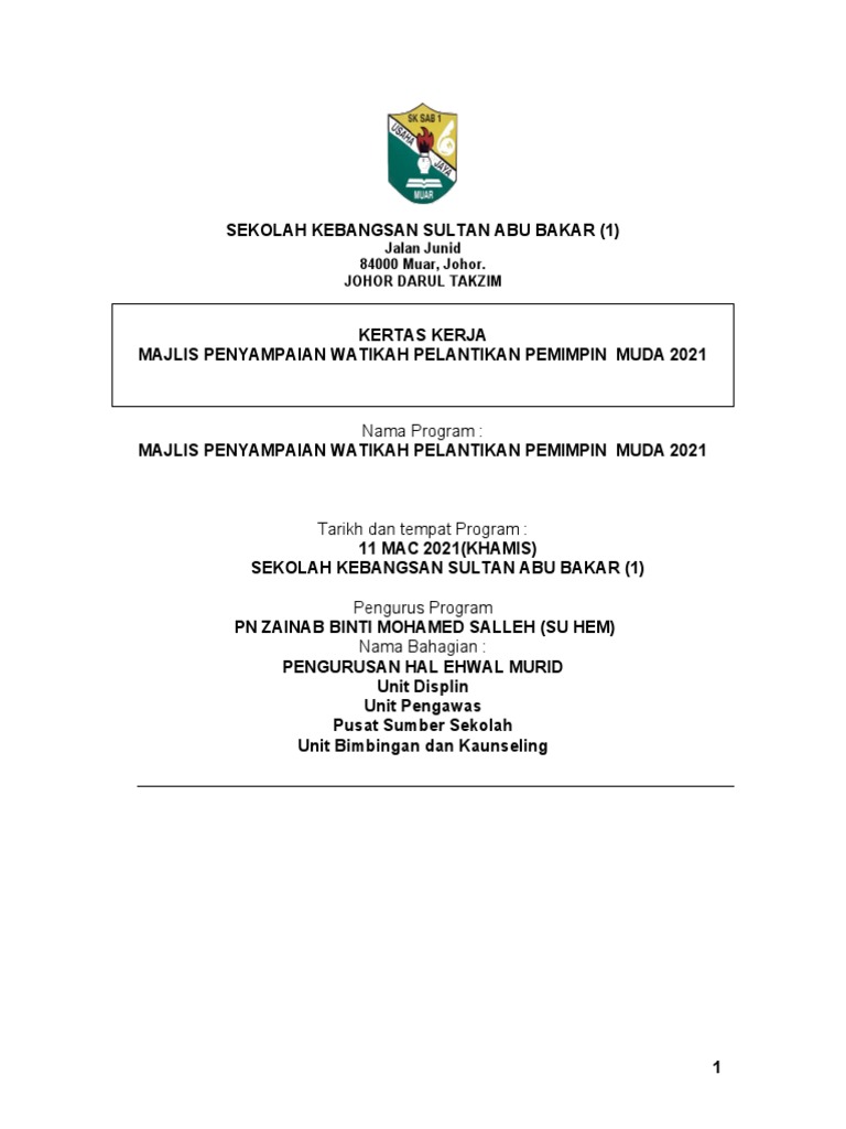 Page 1 Kertas Kerja Majlis Watikah Pemimpin Muda Sk Kuala Kedah 2022
